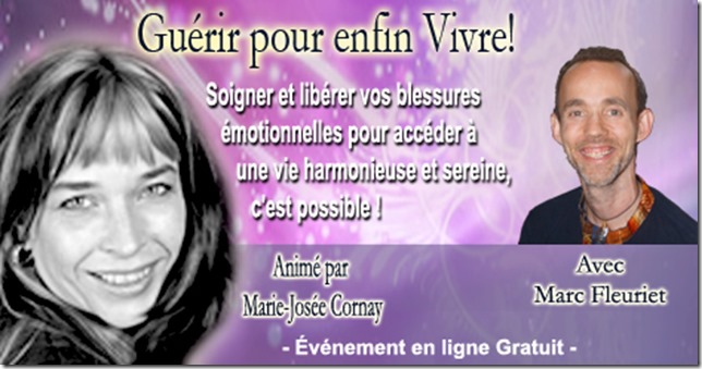 Cet évènement animé par Marie-Josée Cornay, où moi-même et 21+ autres experts, auteurs, conférenciers Thérapeutes et Coachs nous nous sommes joints à ce Télé-Sommet ‘’Guérir pour enfin Vivre ! – Soigner et libérer vos blessures émotionnelles pour accéder à une vie plus harmonieuse et sereine, c’est possible !, qui sera lancé le 19 mai prochain.